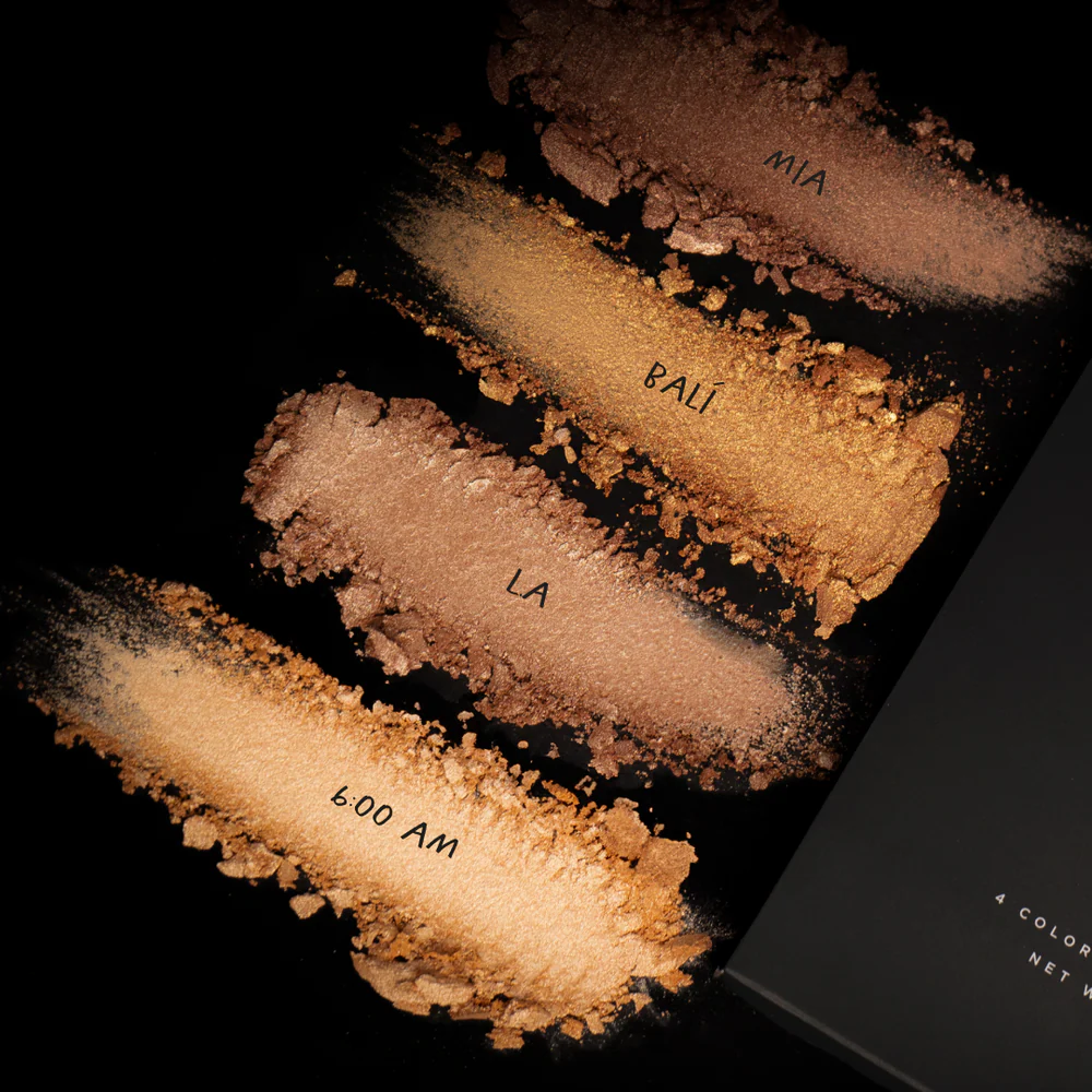 ESTA PALETA DE ILUMINADORES CUENTA CON 4 TONOS ENTRE DORADOS Y ORO ROSA, DE ACABADO SATINADO Y ALTA PIGMENTACIÓN, IDEALES PARA APORTAR LUZ Y REALCE A TU ROSTRO.